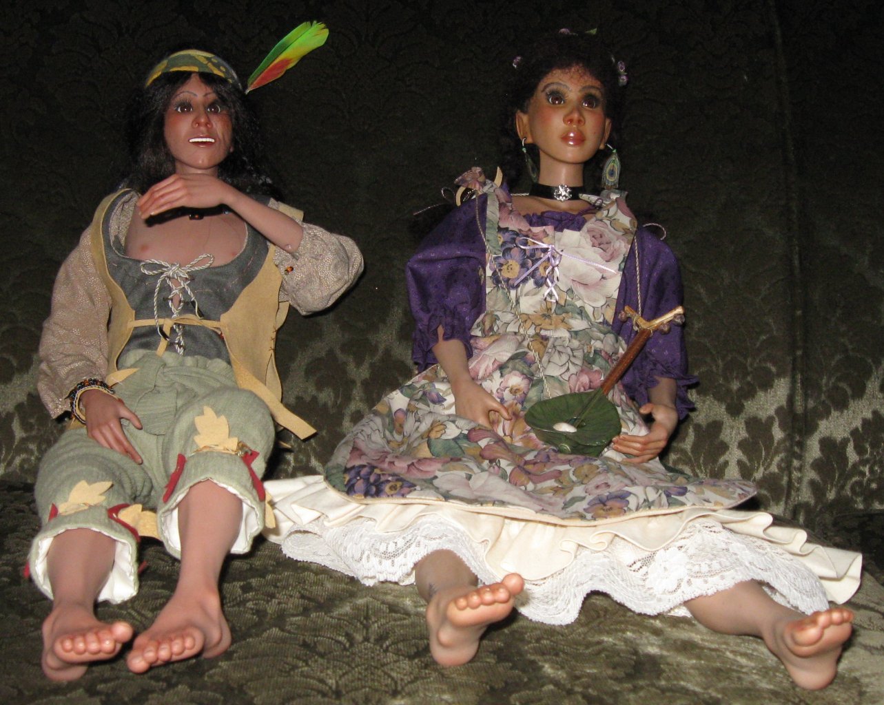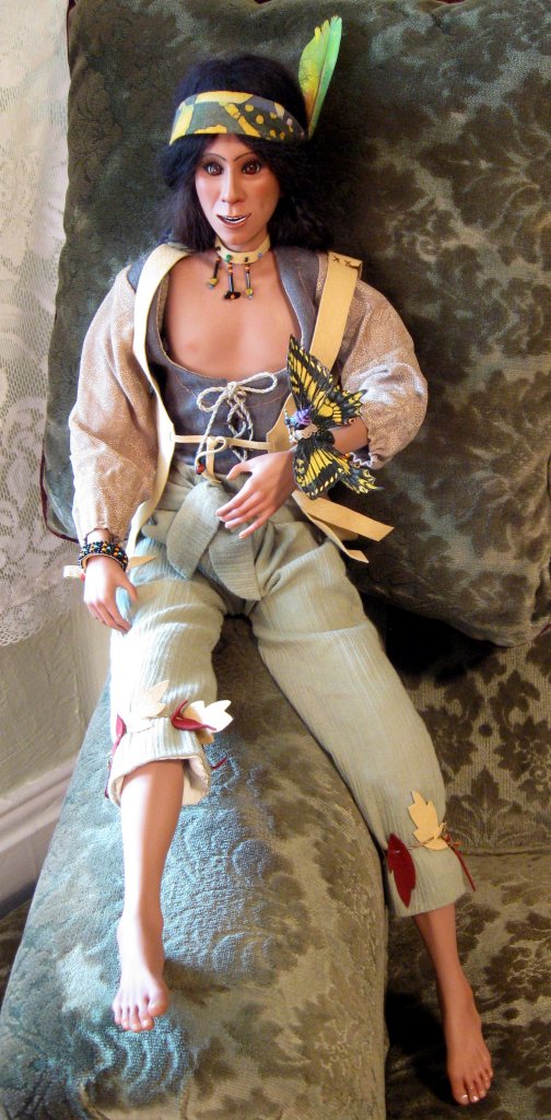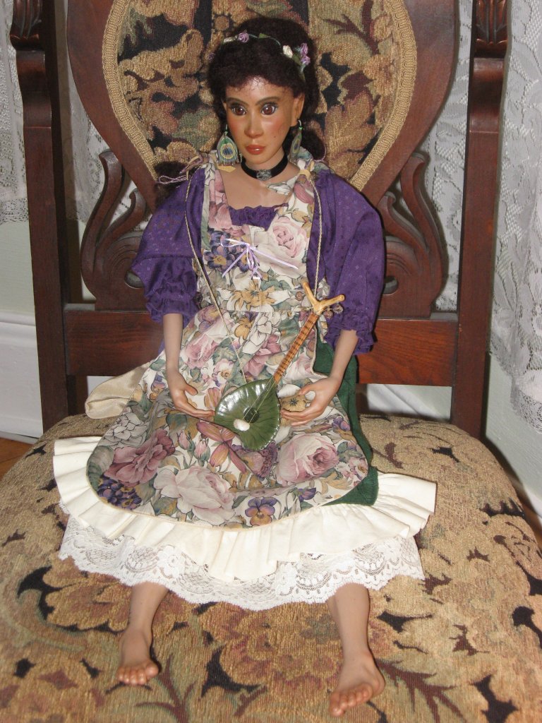 Sooz creates highly detailed, original dolls. She begins with sculpture in earth clay and pours multi-part moulds in plaster. She uses the moulds to cast porcelain greenware, which she then low-fires, refines, high-fires, and finally paints and refires as necessary.